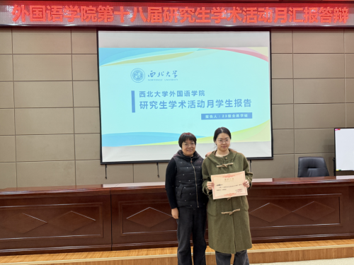 In this academic month report defense, there were first, second, and third prizes, with six awards in total. The papers were initially screened and scored, and the final evaluation was based on the defense performance combined with the scores from the written papers. After comprehensive scoring, the judges selected the award-winning students for this year's Graduate Academic Activities Month. The final results were as follows: Wang Yiqun, a student from the 2023 cohort in Foreign Linguistics and Applied Linguistics, won first place; Xu Yun'en from Foreign Linguistics and Applied Linguistics and Huang Li from Country and Region Studies won second place; and Hu Gang from Country and Region Studies, Zhang Yujun, and Yu Wenjing from Foreign Linguistics and Applied Linguistics won third place. Finally, the attending faculty members presented awards to the winning students, and a group photo was taken with all faculty and students. The Graduate Academic Activities Month Report Defense concluded successfully!