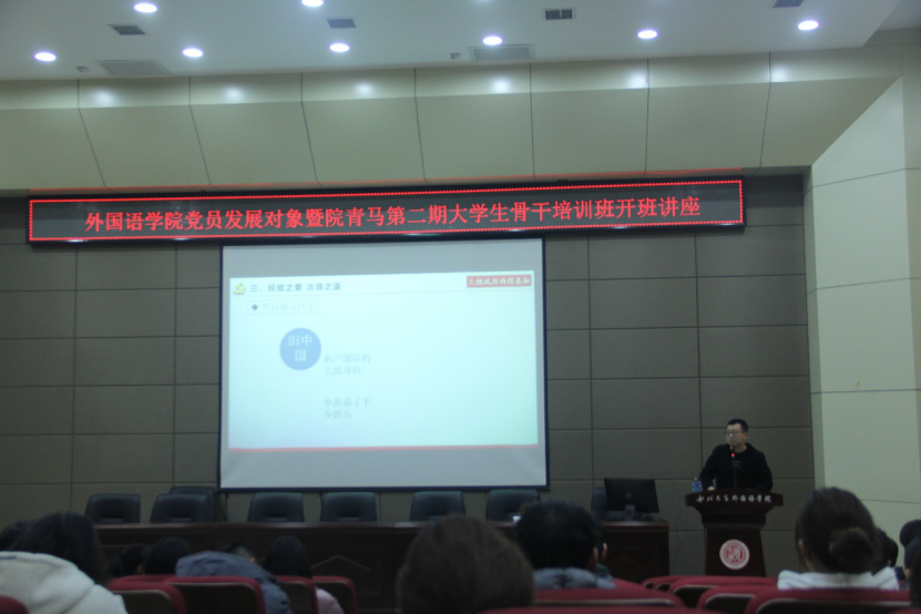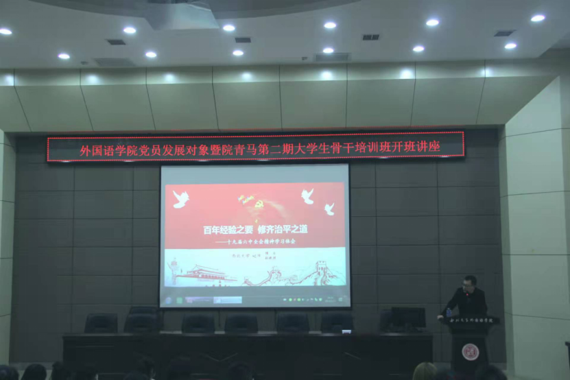 为全面贯彻学习党的十九届六中全会精神,12月3日下午,学院党委邀请了马克思主义学院副教授、西北大学青年讲师团成员、全国教学能手赵沛老师和学院党委书记王军老师开展了学习党的十九届六中全会精神专题讲座,学院2021年下半年发展对象和院青马第二期学员共80余人参加了此次讲座,讲座由学院党委委员、团委书记曹智主持。