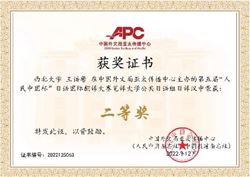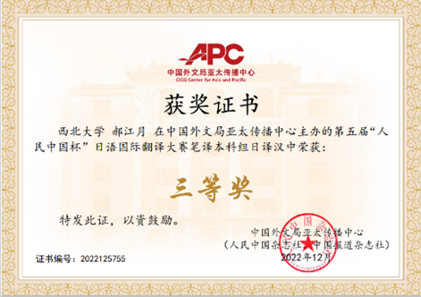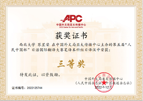 在近日结束的 “第五届人民中国杯日语国际翻译大赛” 中,我校参赛选手在我院竞赛团队指导下喜获佳绩。