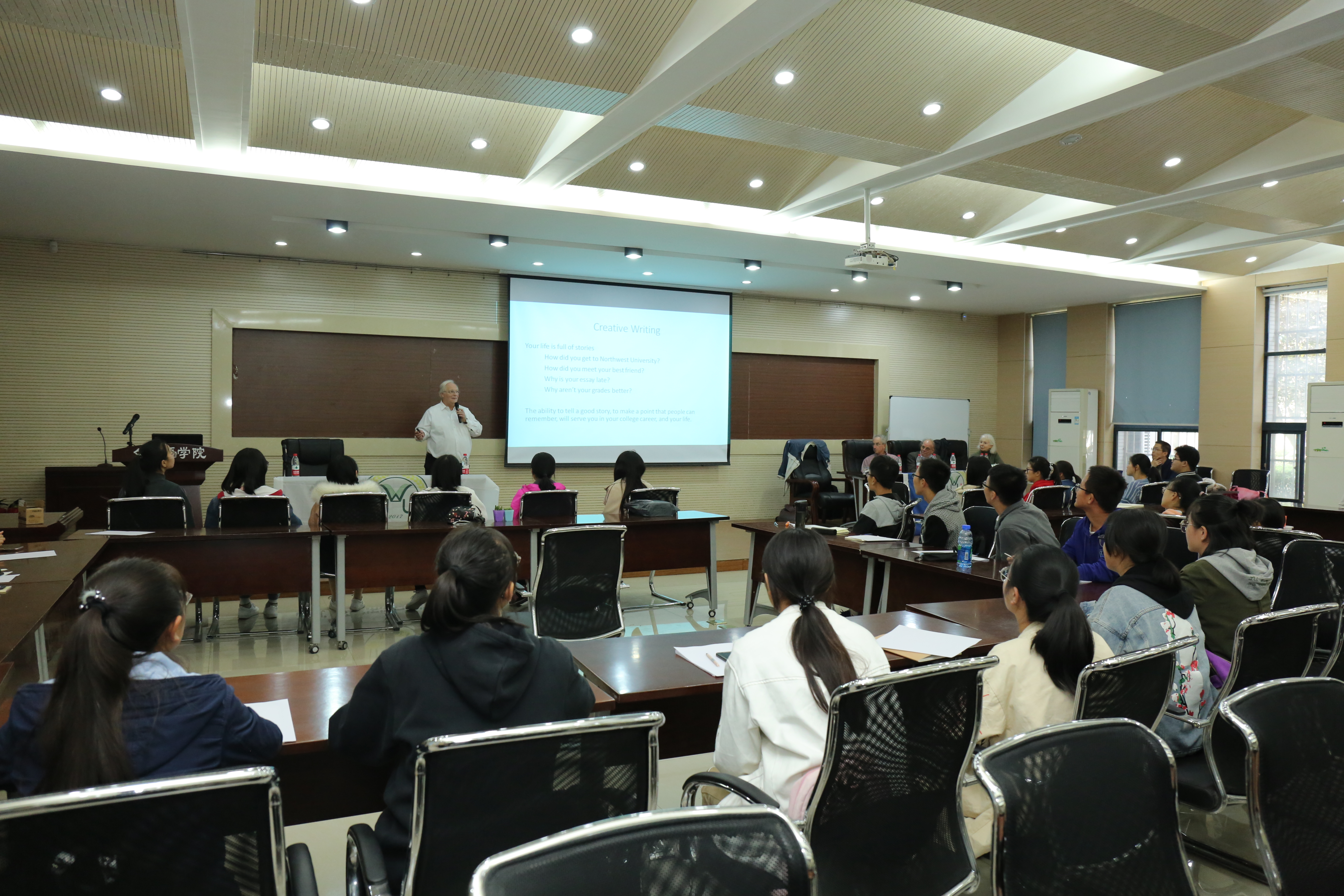 2018年10月25日下午,在教学副院长曹若男和4位美国志愿者的大力支持下,我院西北大学读写演讲训练基地写作中心在口译模拟实验室举办了创意写作沙龙活动。此次活动由写作中心团队教师许娜负责主持,团队其他教师成员贾琼、李艳(小)和邵润平参与组织,有近70名学生参加了活动。