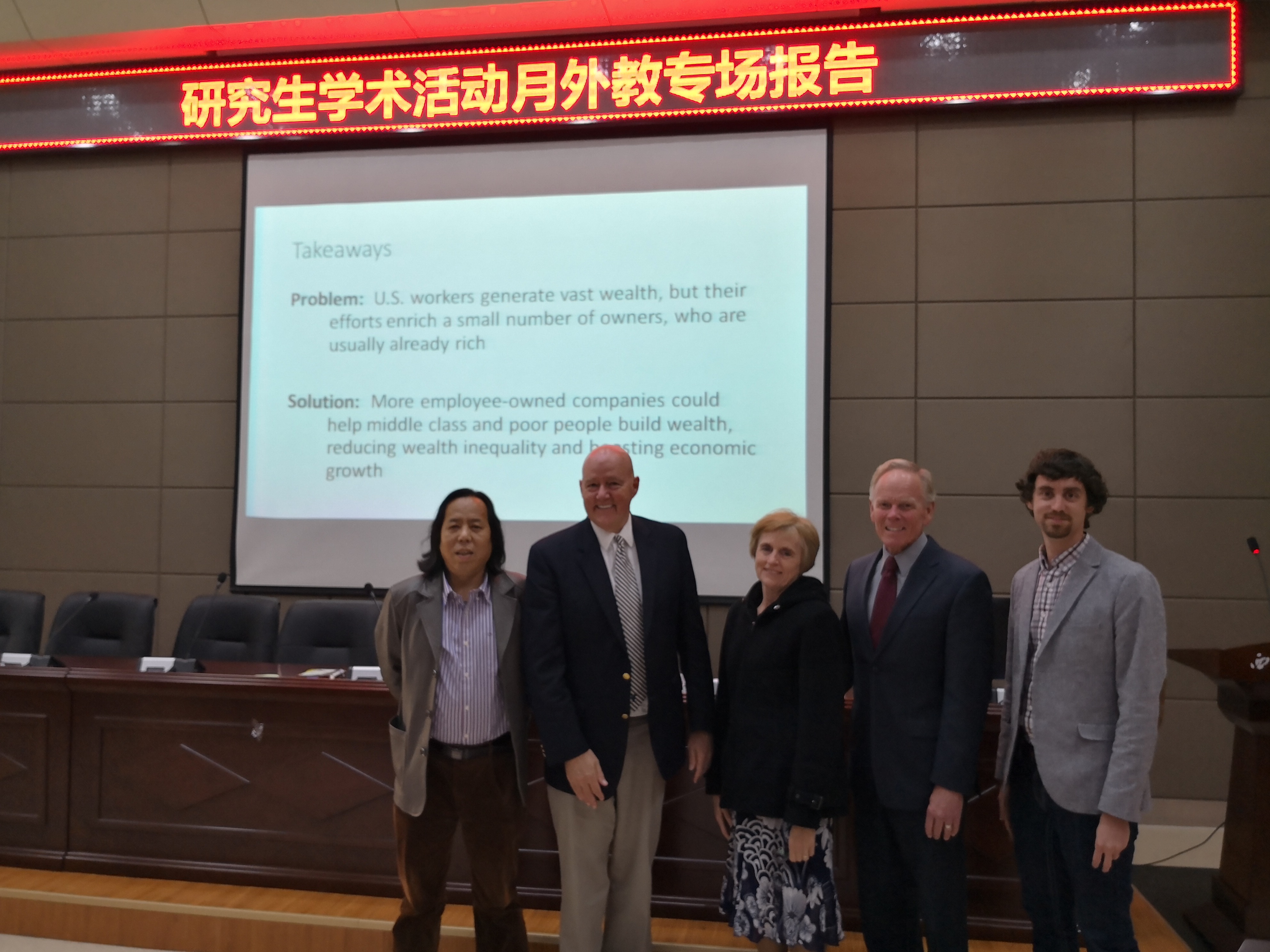 Mark Mygrant(马克·麦格兰特)以“不平等的美国财富”为题作了精彩报告。他以详实的数据剖析了美国经济不平等的现状,并针对问题提出了自己的解决方案。他介绍道,当前美国收入不平等现状正在急速加剧,80%的社会财富掌握在10%的少数人手里,民主状况正在遭受破坏。与此同时,美国刑事司法系统正在被私有化,变得对富人有利,而穷人和无家可归者在司法体系中处于弱势地位。他认为,传统的增税措施无法从根本上扭转贫富差距不断扩大的局面,而企业员工持股制能够有效促进员工的劳动积极性,有助于完善社会保障体系,减少人口老龄化对社会的压力,并进一步促进经济增长,从而提高弱势群体的社会地位和收入水平,缓解阶级固化所带来的尖锐矛盾,提高社会流动。