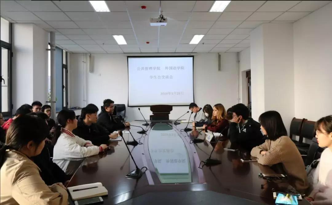 为增进公共管理学院与我院学生会之间的友谊,增加学生会成员内部的整体凝聚力,促进两院友好往来。2019年3月25日下午6点,公共管理学院苏林老师和外国语学院赵明星老师及两院学生会代表在西学楼503教室共同进行了一场令人颇受启迪的学生交流座谈会。
