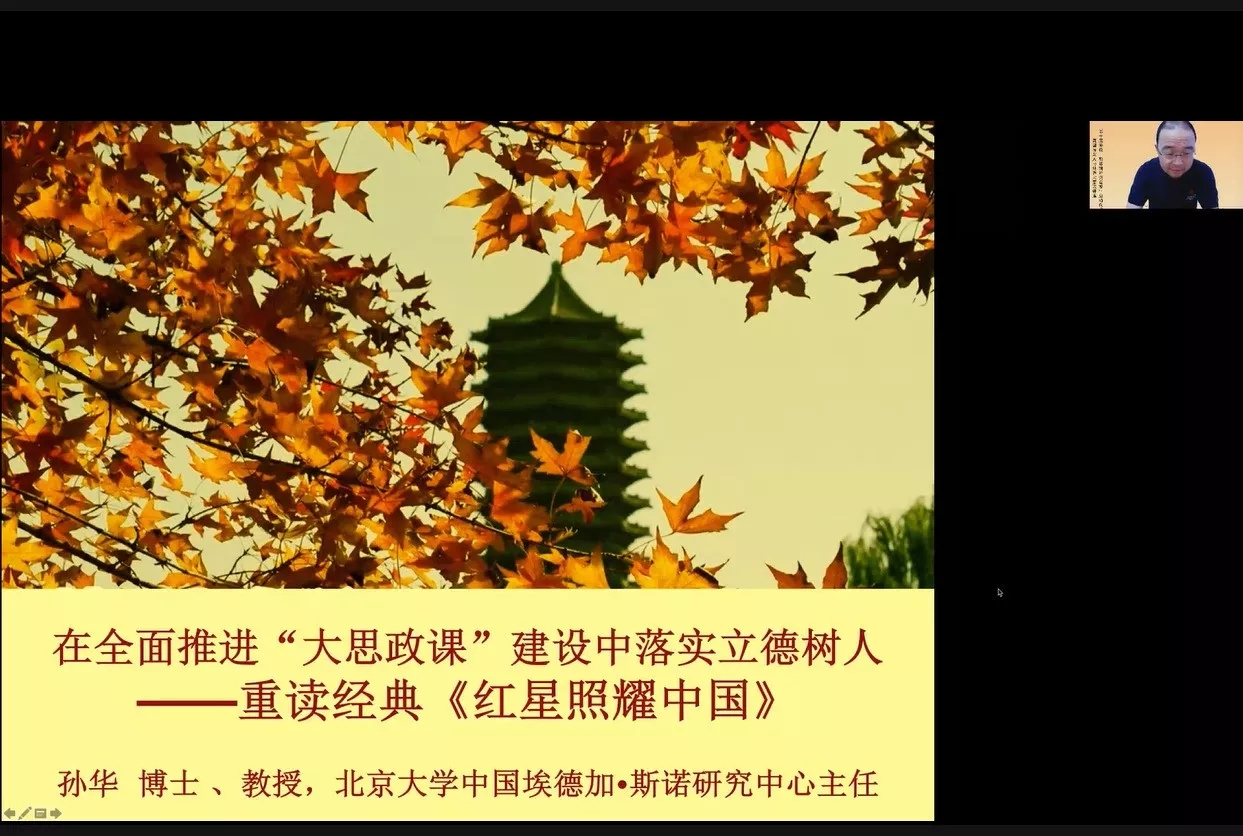 本次讲座主讲人孙华教授,为北京大学中国埃德加·斯诺研究中心主任、北京大学教师教学发展中心主任。 孙华教授以“全面推进‘大思政课’建设中落实立德树人——重温经典《红星照耀中国》”为主题分享了如何将深入领会红色精神,并将其融入课程思政。孙教授讲到: "《红星照耀中国》促进了世界各国和中国之间的相互了解,为世界各国人民了解中国、了解中国共产党和中国工农红军提供了直接的第一手素材。《红星照耀中国》这本书中人物的刻画反映了共产党人的伟大胸襟,反映了他们朝气蓬勃的精神面貌、可歌可泣的动人事迹。这一段是我党历史上非常光辉灿烂的一页,重读经典《红星照耀中国》,以史为鉴,能更好把握当下、赢得未来。结合斯诺著作的重大意义,孙主任建议各个教师应当充分利用学校红色资源,充分调动社会力量,建设"大课堂"、搭建"大平台"、建好"大师资",打造学校特色思政课品牌。