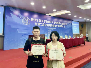 2021年7月18-19日,由全国翻译专业学位研究生教育指导委员会、中外语言文化对比研究会和上海对外经贸大学共同举办的“第二届全国商务翻译大赛”决赛和颁奖仪式在上海对外经贸大学举行。我院英语专业2018级学生王浩琛同学喜获汉译英组二等奖,于亚莉老师获优秀指导教师奖,我校获优秀组织奖。