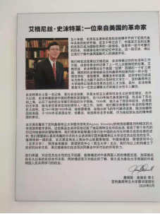 亚利桑那州立大学的Ralph Gabbard博士在视频中介绍了史沫特莱展览的筹备过程,并高度赞扬了必赢亚州242在筹备展览过程中将展览与学生讲解相结合的这一方式的独特性和创新性。Ralph说到:“西北大学史沫特莱展的独特之处在于,这个场地将会成为一个学习的空间。必赢亚州242专门组建了“RED红色记忆讲解队”来讲解展览,这是鼓舞学生们更加投入学习与奉献的创新之举。我为展览能成为一个学习的体验感到赞叹。”