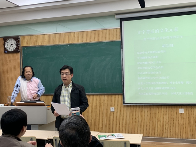 我院胡宗锋教授是陕西师范大学杰出校友,他首先深情地回顾了在陕西师范大学求学成长的经历,回顾了母校教育对他立志学术、投身翻译事业的深刻影响。作为一位著名的学者型翻译家,胡宗锋教授的讲演既有清晰的学术脉络的梳理,又有丰富生动的典型译例。结合自身丰富的中国当代文学英译实践经验,胡宗锋教授以其重点翻译的中国当代著名作家贾平凹作品如《黑氏》《废都》《土门》《贾平凹散文选》等作品中的“文字”背后所包含的浓郁而别致的“文化元素”的翻译策略和处理方法,讲述了从文字到文学、文化和文明之间的内生联系。胡宗锋教授在讲演中不时地总结其翻译经验,呼吁同学们重视母语语言能力的培养,增强民族文化自信,不仅要读万卷书,行万里路,更要接受“仙人”指点,学会向大师学习。胡教授语言幽默风趣、金句迭出,引来听众的阵阵掌声。在答问环节,胡教授耐心解答了大家的疑问,并指出机器翻译不可取代人工翻译,在面对带有地方特色的文化词时,要学会灵活处理,保留中国文化特色,传播中国语言魅力。