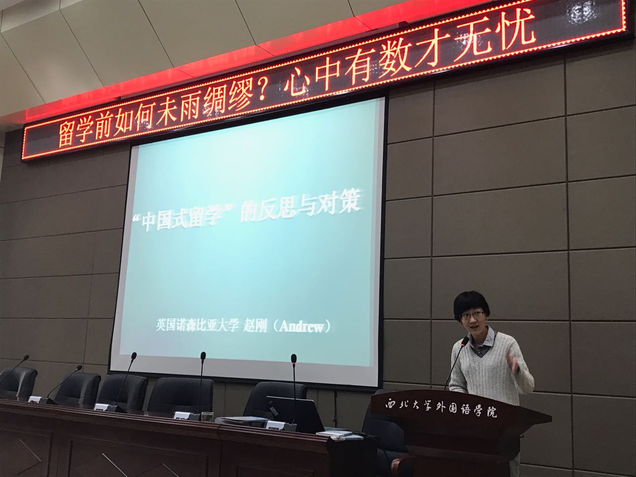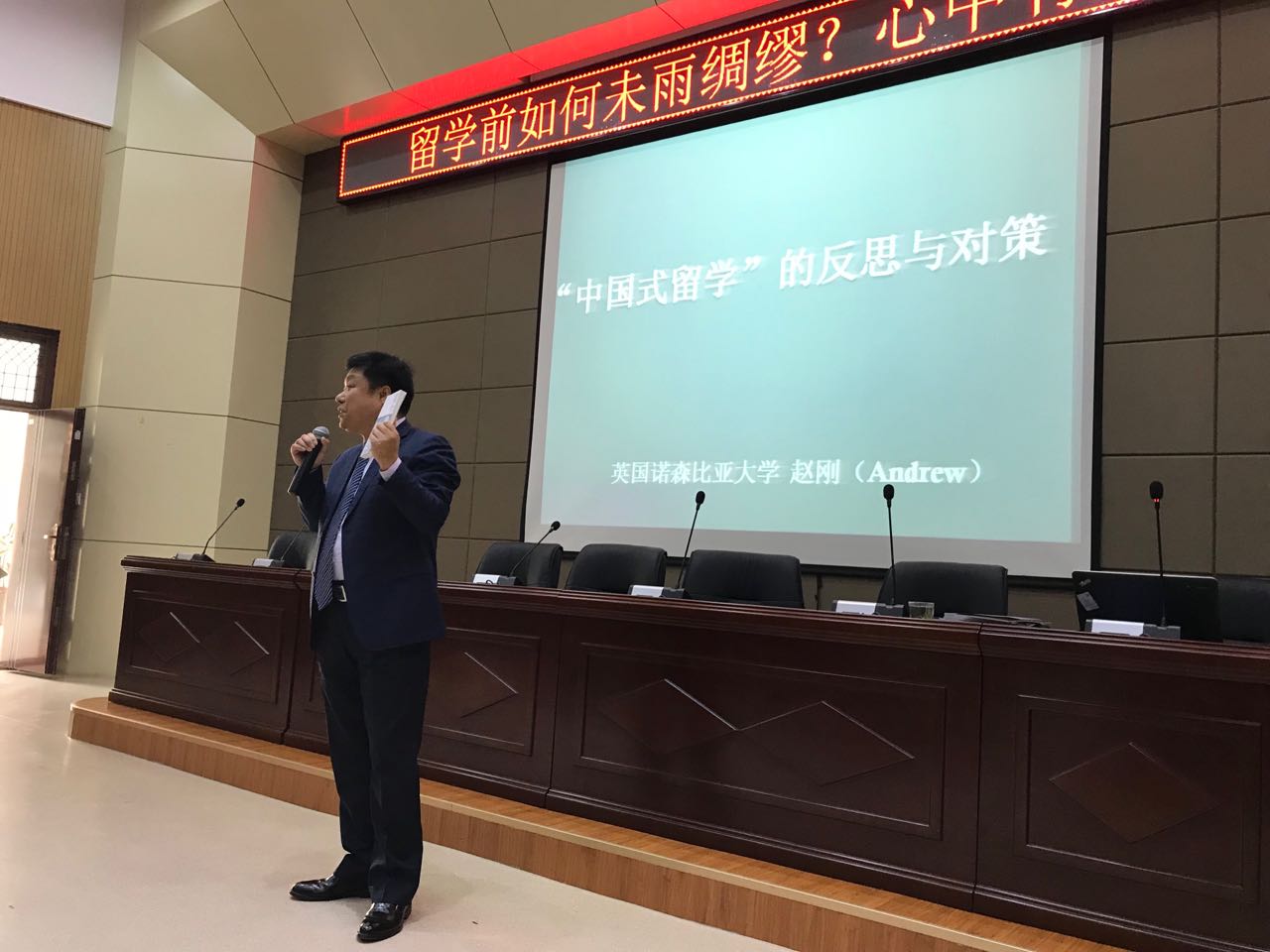 2017年11月8日下午,国际教育知名专家,英国诺森比亚大学中国区首席代表赵刚在外语第二课堂为师生做了题为“中国式留学”的反思与对策讲座。外国语学院教学副院长曹若男出席并介绍了嘉宾。讲座中,赵刚老师用生动案例幽默风趣地向大家讲述了中国式留学存在的问题并鼓励在校大学生养成主动阅读、批判性思维的良好习惯以适应未来的留学生活。