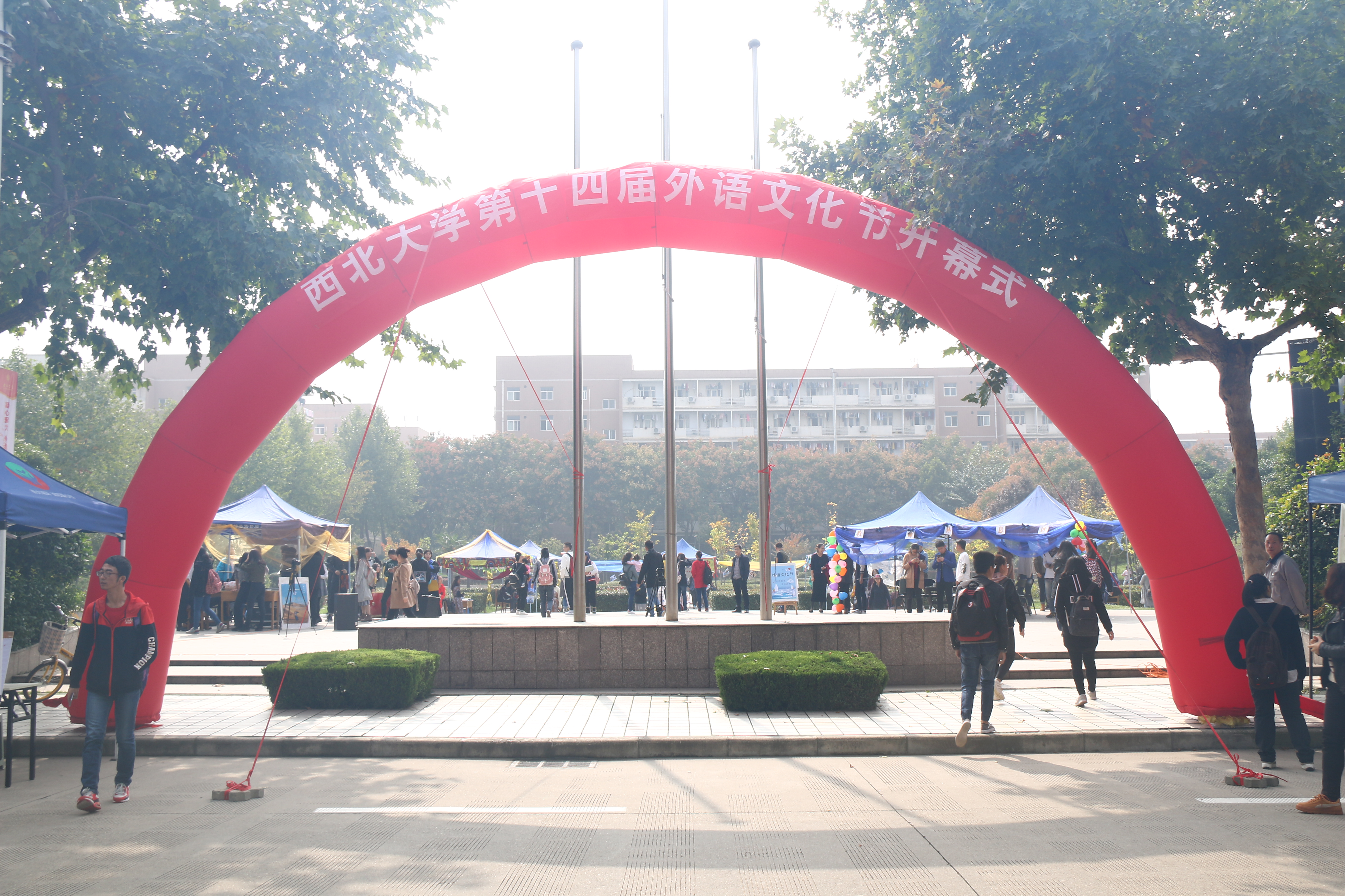 10月19日,由我院主办的第十四届外语文化节在长安校区音乐广场开幕。今年的外语文化节以“外辟新程,语联海陆”为主题,在开幕式中设置海上与陆上两条丝绸之路,连接中亚、土耳其、中国、印度、阿拉伯和非洲展区,通过可口的当地小吃、别致的精美礼品和极具魅力的歌舞表演,给全校师生呈现了一场无与伦比的丝路文化盛宴。