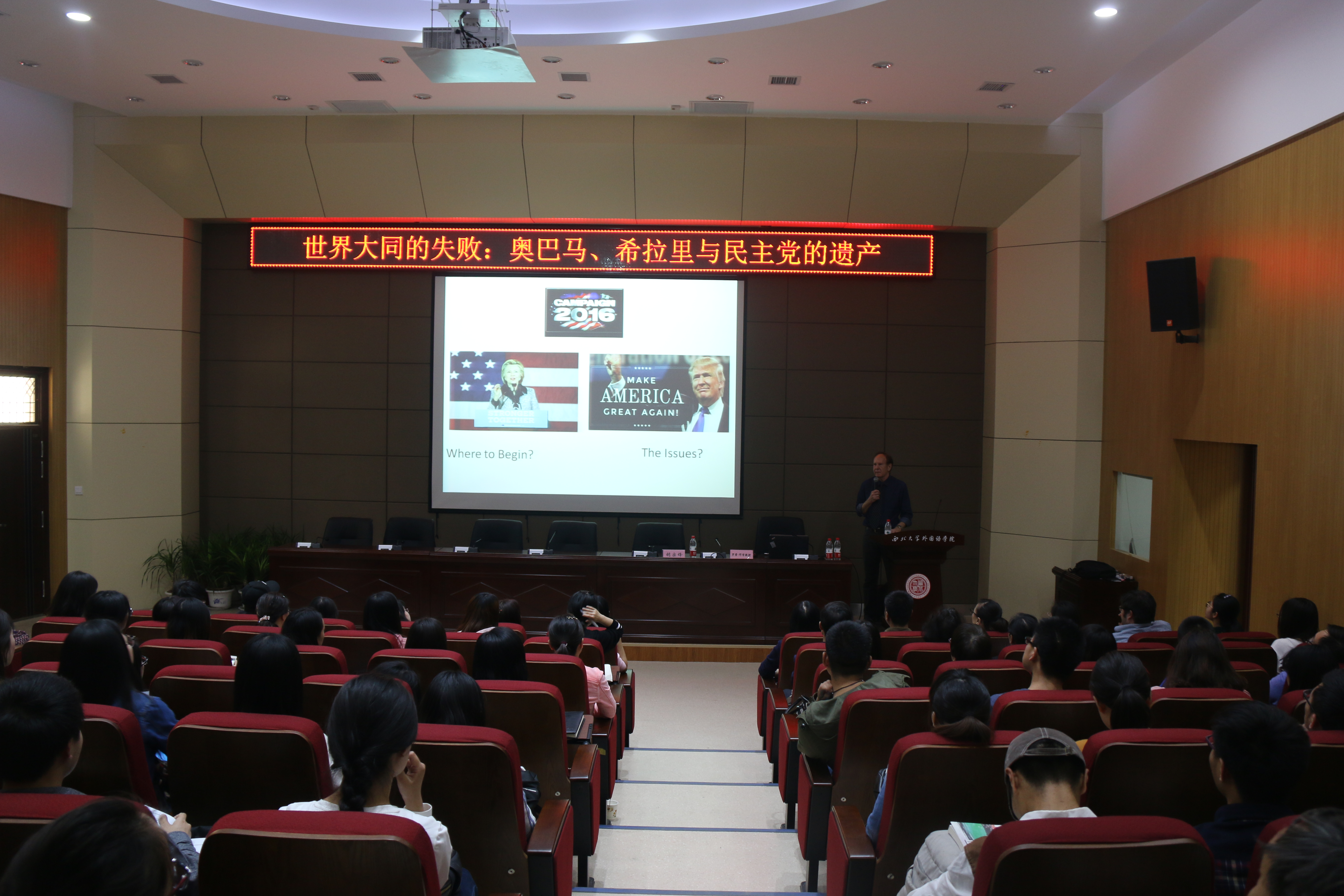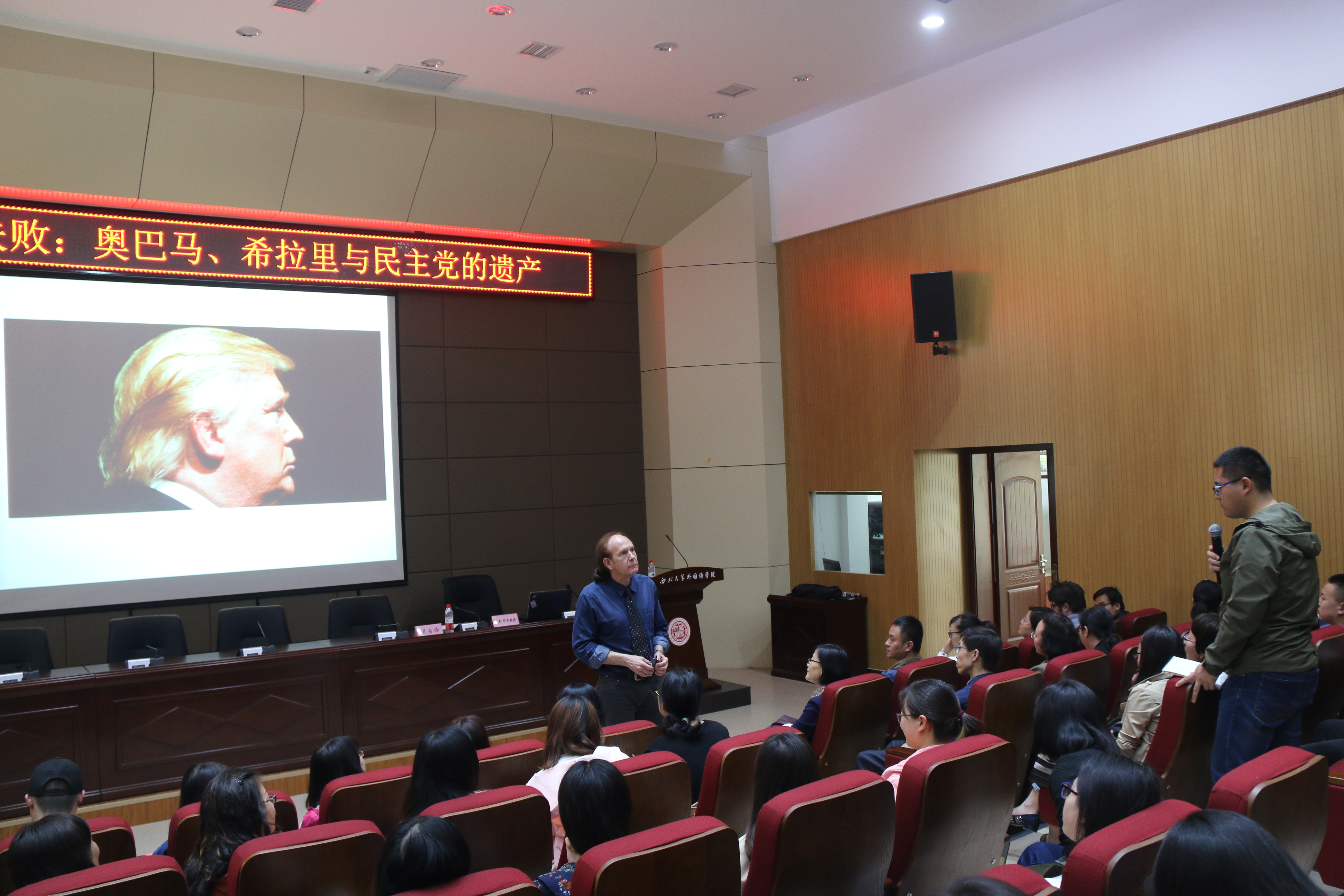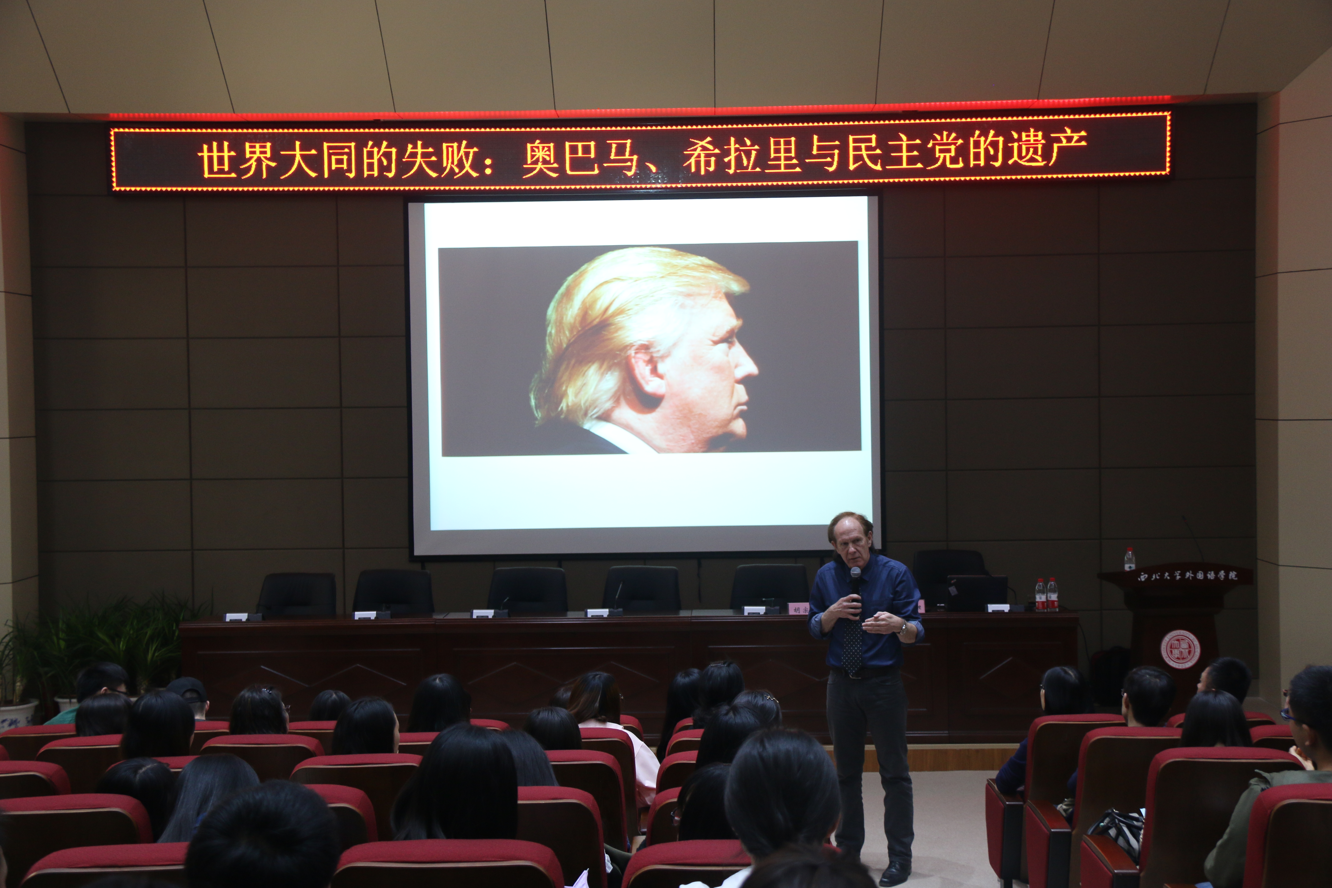 4月24日,美国富布莱特杰出教授、丹麦哥本哈根大学资深教授罗素·邓肯做客我院。在外国语学院第二课堂活动中心做了题为“世界大同的失败:奥巴马、希拉里和民治党的遗产”的报告。此次报告由外国语学院副院长任海棠教授主持,外国语学院师生参与了本次活动。