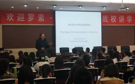 2月23日,美国富布莱特杰出教授,丹麦哥本哈根大学教授罗素·邓肯 Russell Duncan先生应邀来我校为外国语学院师生作了题为“An Era of Possibilities: The New First Generation in America” 〔皆有可能的时代:新第一代(华人)在美国〕的报告。