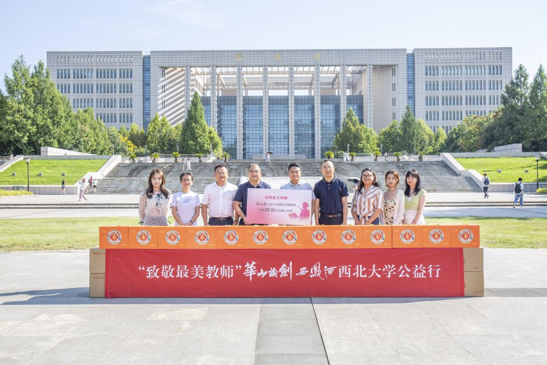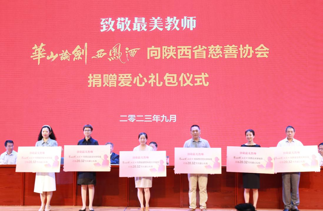 2023年9月8日上午,在第39个教师节来临之际,华山论剑西凤酒“致敬最美教师”爱心满世界公益活动在西北大学长安校区星空报告厅举行。陕西省人大常委会原副主任、省慈善协会会长吴前进,陕西省教育厅副厅长王海波,华山论剑品牌管理有限公司董事长董小军,西北大学校长郭立宏,校党委常委、副校长吴振磊出席活动。省慈善协会、华山论剑品牌管理有限公司、兄弟院校相关负责人,必赢亚州242师生代表参加捐赠仪式。