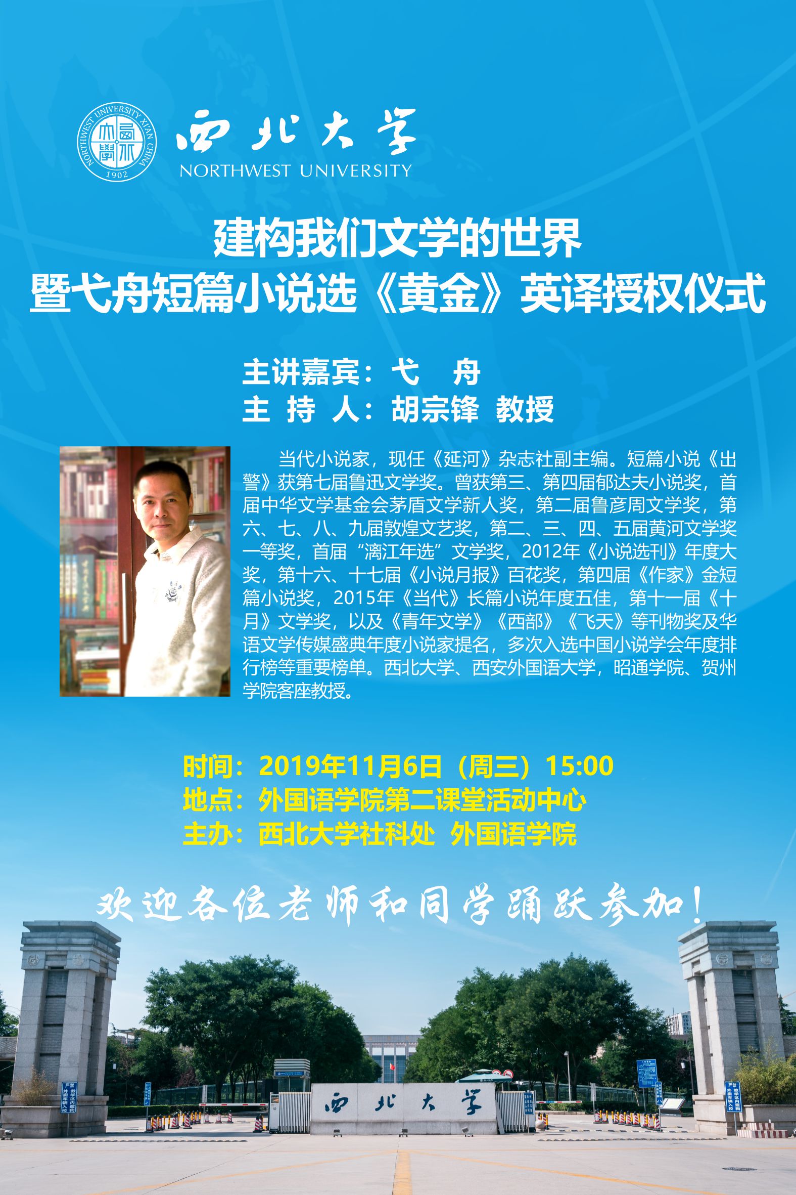 学院定于2019年11月6日(周三)下午15:00举办建构我们文学的世界暨弋舟短篇小说选《黄金》英译授权仪式,欢迎各位老师积极参加。