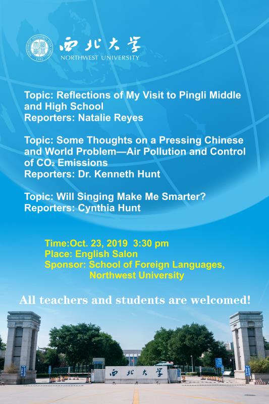 学院定于2019年10月23日(周三)下午15:30举办由外籍专家Natalie Reyes、Dr.Kenneth Hunt、Cynthia Hunt分别主讲的三场学术报告,欢迎各位老师积极参加。