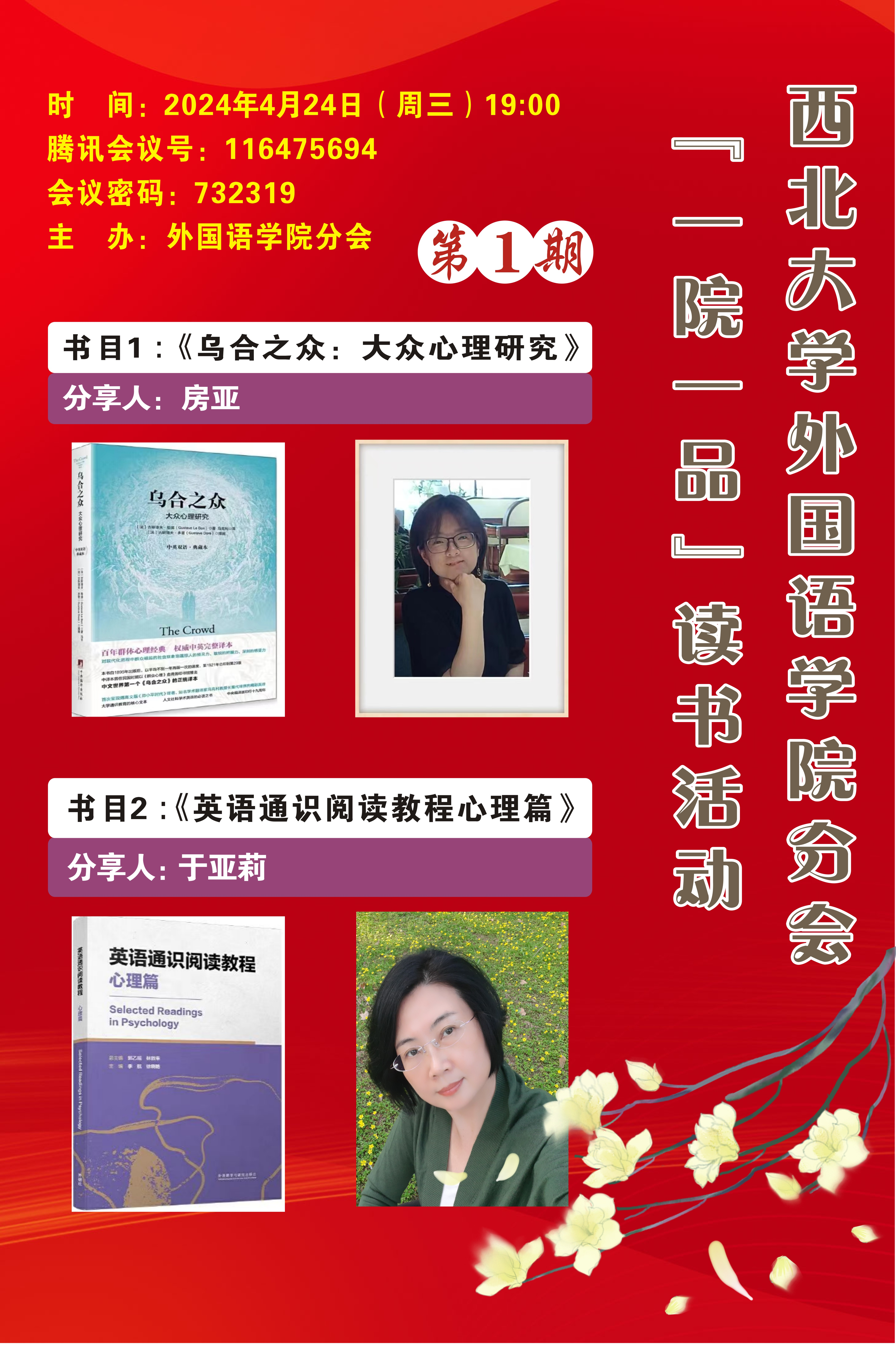 为了迎接联合国教科文组织确立的第29个“世界读书日”(每年4月23日),丰富外院教职工的业余文化生活,充分发挥不同系部的语言专长与优势,建设并落实外国语学院分会“一院一品”项目“各美其美、美美与共”思路下的各项活动,我院计划于2024年4月24日开展主题为“跨越语言的阅读之旅”的读书分享活动。